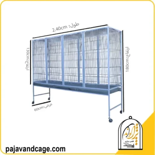 ابعاد این قفس بزرگ و جادار برابر است با طول ۲۴۰ سانتیمتر، عرض ۶۰ سانتیمتر و ارتفاع ۱۲۰ سانتیمتر و با احتساب پایه، ارتفاع کلی آن به ۱۸۰ سانتیمتر میرسد. این فضای وسیع امکان پرواز و تحرک بیشتر را برای پرندگان فراهم میکند و شرایطی ایدهآل برای زندگی سالم و شاداب آنها فراهم میآورد.